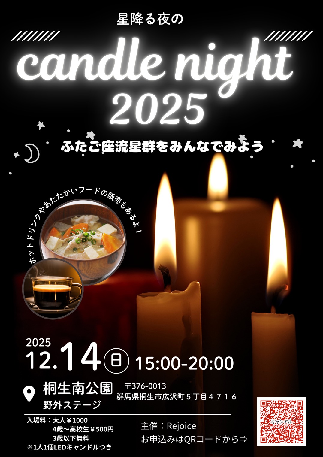 12月14日(日)南公園で「星降る夜のcandle night2025」が開催されます。 この時期、三大流星群の一つ「ふたご座流星群」の活動が活発な時期になります。 キャンドルの灯に包まれながら流れ星を探しませんか? 暖 […]