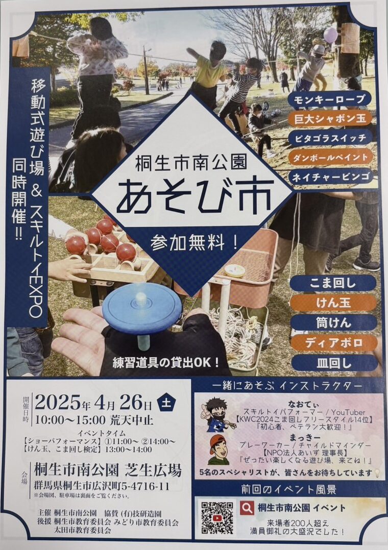 日 時:令和7年4月26日 土曜日 AM10:00~PM3:00 (荒天中止) 場 所:桐生市南公園 芝生広場 講 師:なおてぃ(安村 尚人)、まっきー(牧田 康平)他 内 容:コマやけん玉、段ボール遊び、ロープ […]