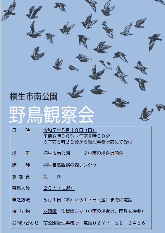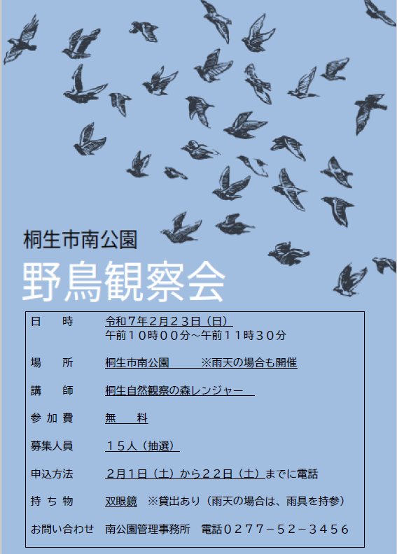 「桐生市南公園野鳥観察会」開催のお知らせ