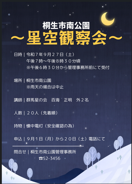日程:令和7年9月27日(土) 午後7時~午後8時30分頃 場所:桐生市南公園 ※雨天の場合は中止 内容:星空を観察し知識を深める。 講師:群馬星の会 百海 正明 氏 外2名 参加費:無料 募集人数:20人(先着順)※ […]