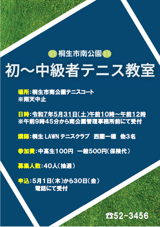 日時:令和7年5月31日(土) 午前10~12時 受付9時45時分~ 南公園管理事務所 会場:桐生市南公園テニスコート(クレーコート) 講習内容:初心者~中級者向け練習会 講師:4名うち1名(令和5年 […]