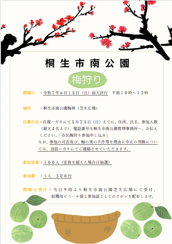開催日:令和7年6月15日(日)雨天決行 午前10時~12時 ※9時30分より開会式 場所:桐生市南公園(芝生広場) 応募方法:往復ハガキにて5月25日(日)までに、住所、氏名、参加人数(最大4名まで)、電話番号 […]